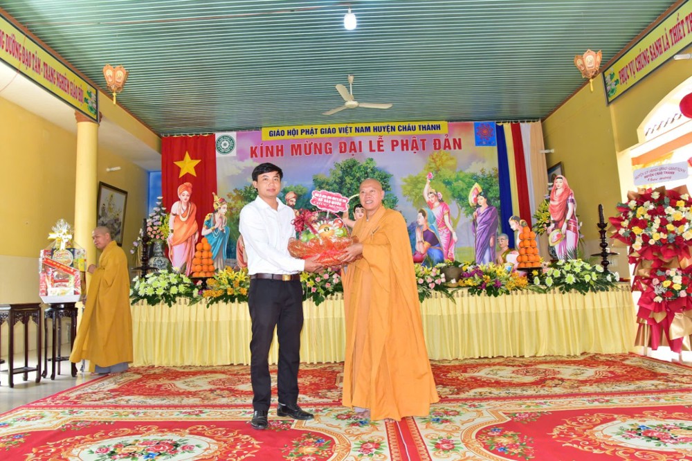 Thượng tọa Thích Thiện Trí – UVTT, Trưởng Ban Phật giáo Quốc tế BTS GHPGVN tỉnh, Phó Trưởng Ban thường trực BTS GHPGVN huyện Châu Thành đọc ý nghĩa Phật Đản của Hòa thượng Thích Bảo Nghiêm – Phó Chủ tịch HĐTS, Trưởng Ban Hoằng pháp Trung ương.