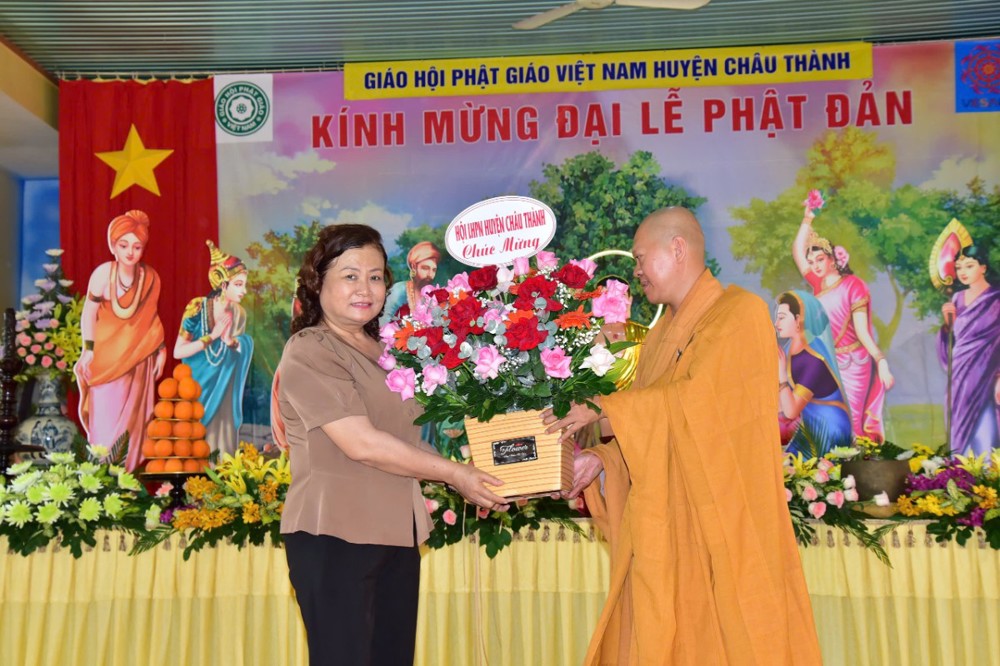Thượng tọa Thích Huệ Chơn ( Minh Đăng ) – Phó BTS GHPGVN tỉnh, Trưởng BTS GHPGVN huyện Châu Thành, Trưởng Ban Tổ chức đã tuyên đọc Diễn văn Đại lễ Phật Đản Vesak 2025 của Trưỡng lão Hòa thượngThích Thiện Nhơn – Phó Pháp chủ HĐCM, Chủ tịch Hội đồng Trị sự GHPGVN: “…Là quốc gia có truyền thống Phật giáo lâu đời và gắn bó mật thiết với tiến trình xây dựng, phát triển đất nước, Việt Nam vinh dự được tổ chức Đại lễ Vesak 2025 trong không khí cả nước tưng bừng kỷ niệm đại thắng lịch sử mùa xuân năm 1975 thống nhất đất nước. Nhìn lại chặng đường lịch sử đó, Phật giáo Việt Nam tự hào đã góp phần vào chiến thắng hào hùng của dân tộc, góp phần làm nên bản lĩnh và trí tuệ Việt Nam với ngọn lửa trái tim bất diệt của Bồ tát Thích Quảng Đức và biết bao các thế hệ Tăng Ni, Phật tử đã dấn thân vì sự nghiệp giải phóng dân tộc. Chặng đường lịch sử hào hùng 50 năm qua cho chúng ta thấy rõ con đường phát triển mà dân tộc Việt Nam đang đi là con đường của sự đoàn kết, của sự bao dung và của một xã hội mà mỗi người đều được sống trong hòa bình, hạnh phúc và an lạc. Con đường đó đang đưa đất nước bước vào kỷ nguyên mới, kỷ nguyên vươn mình của dân tộc, phát triển phồn vinh, thịnh vượng “.