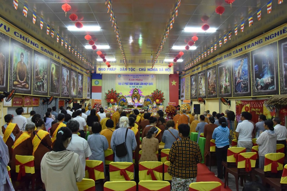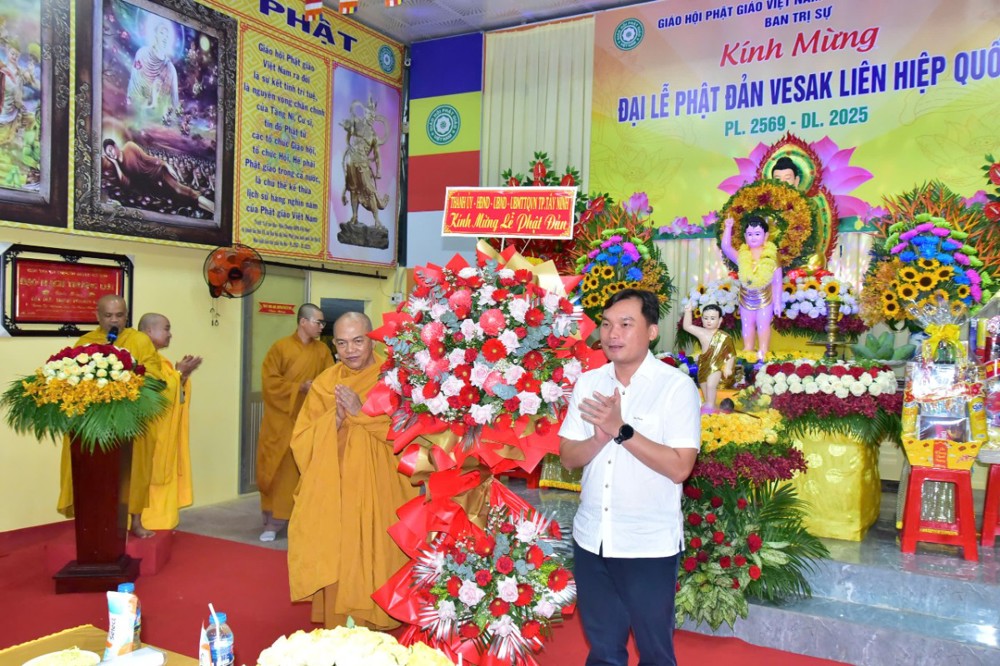 Thượng tọa Thích Minh Tựu – UV BTS GHPGVN tỉnh, Phó BTS GHPGVN TP Tây Ninh tuyên đọc Diễn văn Đại lễ Phật Đản Vesak 2025 của Trưỡng lão Hòa thượng Thích Thiện Nhơn – Phó Pháp chủ HĐCM, Chủ tịch Hội đồng Trị sự GHPGVN: “…Là quốc gia có truyền thống Phật giáo lâu đời và gắn bó mật thiết với tiến trình xây dựng, phát triển đất nước, Việt Nam vinh dự được tổ chức Đại lễ Vesak 2025 trong không khí cả nước tưng bừng kỷ niệm đại thắng lịch sử mùa xuân năm 1975 thống nhất đất nước. Nhìn lại chặng đường lịch sử đó, Phật giáo Việt Nam tự hào đã góp phần vào chiến thắng hào hùng của dân tộc, góp phần làm nên bản lĩnh và trí tuệ Việt Nam với ngọn lửa trái tim bất diệt của Bồ tát Thích Quảng Đức và biết bao các thế hệ Tăng Ni, Phật tử đã dấn thân vì sự nghiệp giải phóng dân tộc. Chặng đường lịch sử hào hùng 50 năm qua cho chúng ta thấy rõ con đường phát triển mà dân tộc Việt Nam đang đi là con đường của sự đoàn kết, của sự bao dung và của một xã hội mà mỗi người đều được sống trong hòa bình, hạnh phúc và an lạc. Con đường đó đang đưa đất nước bước vào kỷ nguyên mới, kỷ nguyên vươn mình của dân tộc, phát triển phồn vinh, thịnh vượng “.