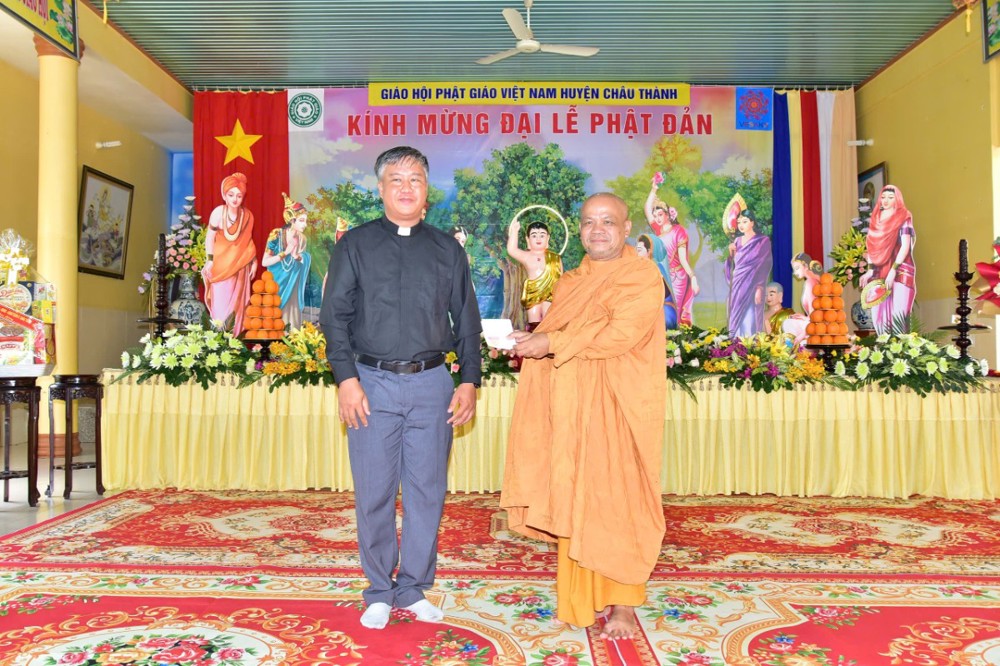 Thượng tọa Thích Huệ Chơn ( Minh Đăng ) – Phó BTS GHPGVN tỉnh, Trưởng BTS GHPGVN huyện Châu Thành, Trưởng Ban Tổ chức đã tuyên đọc Diễn văn Đại lễ Phật Đản Vesak 2025 của Trưỡng lão Hòa thượngThích Thiện Nhơn – Phó Pháp chủ HĐCM, Chủ tịch Hội đồng Trị sự GHPGVN: “…Là quốc gia có truyền thống Phật giáo lâu đời và gắn bó mật thiết với tiến trình xây dựng, phát triển đất nước, Việt Nam vinh dự được tổ chức Đại lễ Vesak 2025 trong không khí cả nước tưng bừng kỷ niệm đại thắng lịch sử mùa xuân năm 1975 thống nhất đất nước. Nhìn lại chặng đường lịch sử đó, Phật giáo Việt Nam tự hào đã góp phần vào chiến thắng hào hùng của dân tộc, góp phần làm nên bản lĩnh và trí tuệ Việt Nam với ngọn lửa trái tim bất diệt của Bồ tát Thích Quảng Đức và biết bao các thế hệ Tăng Ni, Phật tử đã dấn thân vì sự nghiệp giải phóng dân tộc. Chặng đường lịch sử hào hùng 50 năm qua cho chúng ta thấy rõ con đường phát triển mà dân tộc Việt Nam đang đi là con đường của sự đoàn kết, của sự bao dung và của một xã hội mà mỗi người đều được sống trong hòa bình, hạnh phúc và an lạc. Con đường đó đang đưa đất nước bước vào kỷ nguyên mới, kỷ nguyên vươn mình của dân tộc, phát triển phồn vinh, thịnh vượng “.