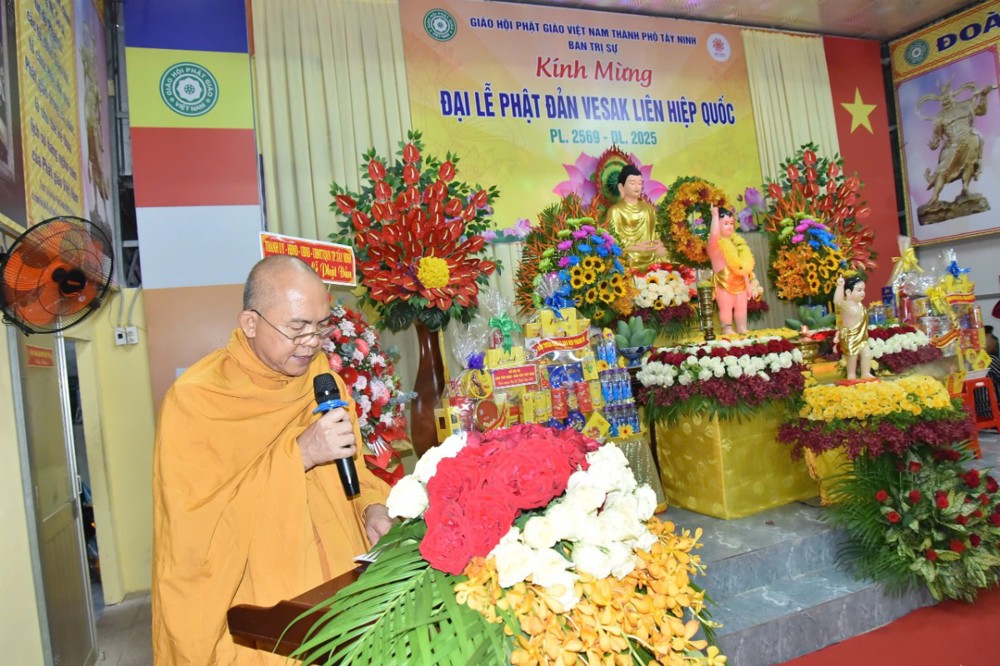 Thượng tọa Thích Minh Tựu – UV BTS GHPGVN tỉnh, Phó BTS GHPGVN TP Tây Ninh tuyên đọc Diễn văn Đại lễ Phật Đản Vesak 2025 của Trưỡng lão Hòa thượng Thích Thiện Nhơn – Phó Pháp chủ HĐCM, Chủ tịch Hội đồng Trị sự GHPGVN: “…Là quốc gia có truyền thống Phật giáo lâu đời và gắn bó mật thiết với tiến trình xây dựng, phát triển đất nước, Việt Nam vinh dự được tổ chức Đại lễ Vesak 2025 trong không khí cả nước tưng bừng kỷ niệm đại thắng lịch sử mùa xuân năm 1975 thống nhất đất nước. Nhìn lại chặng đường lịch sử đó, Phật giáo Việt Nam tự hào đã góp phần vào chiến thắng hào hùng của dân tộc, góp phần làm nên bản lĩnh và trí tuệ Việt Nam với ngọn lửa trái tim bất diệt của Bồ tát Thích Quảng Đức và biết bao các thế hệ Tăng Ni, Phật tử đã dấn thân vì sự nghiệp giải phóng dân tộc. Chặng đường lịch sử hào hùng 50 năm qua cho chúng ta thấy rõ con đường phát triển mà dân tộc Việt Nam đang đi là con đường của sự đoàn kết, của sự bao dung và của một xã hội mà mỗi người đều được sống trong hòa bình, hạnh phúc và an lạc. Con đường đó đang đưa đất nước bước vào kỷ nguyên mới, kỷ nguyên vươn mình của dân tộc, phát triển phồn vinh, thịnh vượng “.